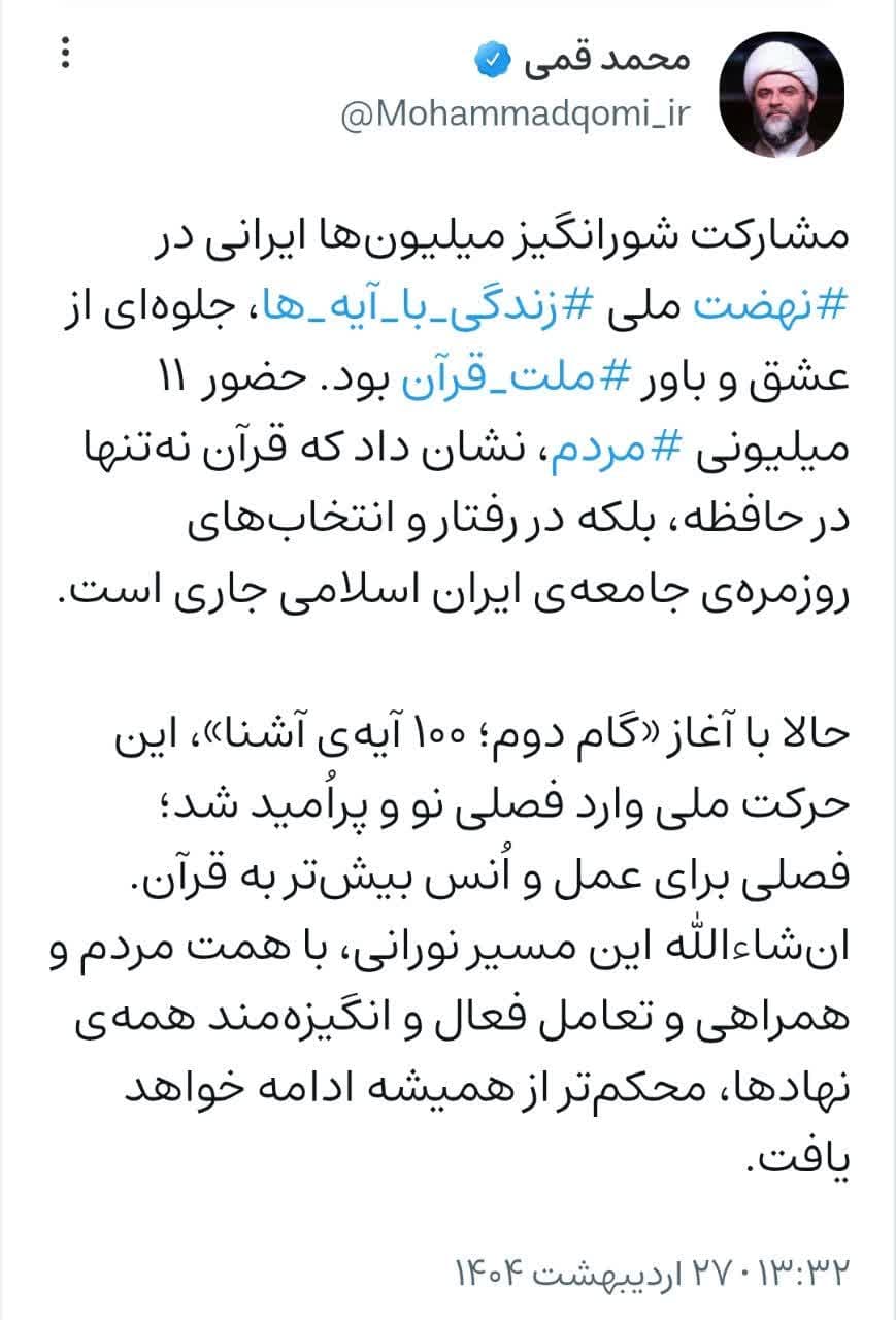 به گزارش روابط عمومی سازمان تبلیغات اسلامی، حجتالاسلام محمد قمی، رئیس سازمان تبلیغات اسلامی در صفحه شخصی خود در شبکه ویراستی درباره نهضت ملی زندگی با آیهها نوشت؛