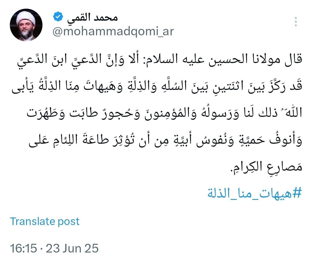 به گزارش روابط عمومی سازمان تبلیغات اسلامی، حجتالاسلام محمد قمی، رئیس سازمان تبلیغات اسلامی، در واکنش به جنایات رژیم صهیونیستی به خاک کشورمان بخشی از خطبهی سیدالشهدا(ع) در روز عاشورا را در صفحهی شخصی خود در شبکه اجتماعی ایکس ویژهی مخاطبان عربزبان منتشر کرد و نوشت: