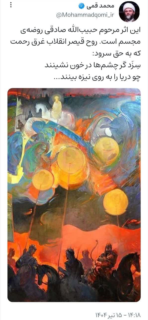 به گزارش روابط عمومی سازمان تبلغیات اسلامی، حجت‌الاسلام محمد قمی، رئیس سازمان تبلیغات اسلامی در روز عاشورا با انتشار اثر عاشورایی مرحوم «حبیب‌الله صادقی» و با اشاره به ابیاتی از مرحوم «قیصر امین‌پور»، دو چهره‌ی فقید هنر انقلاب نوشت؛