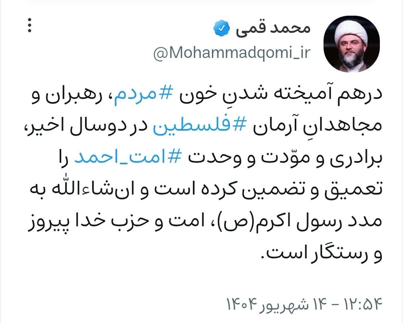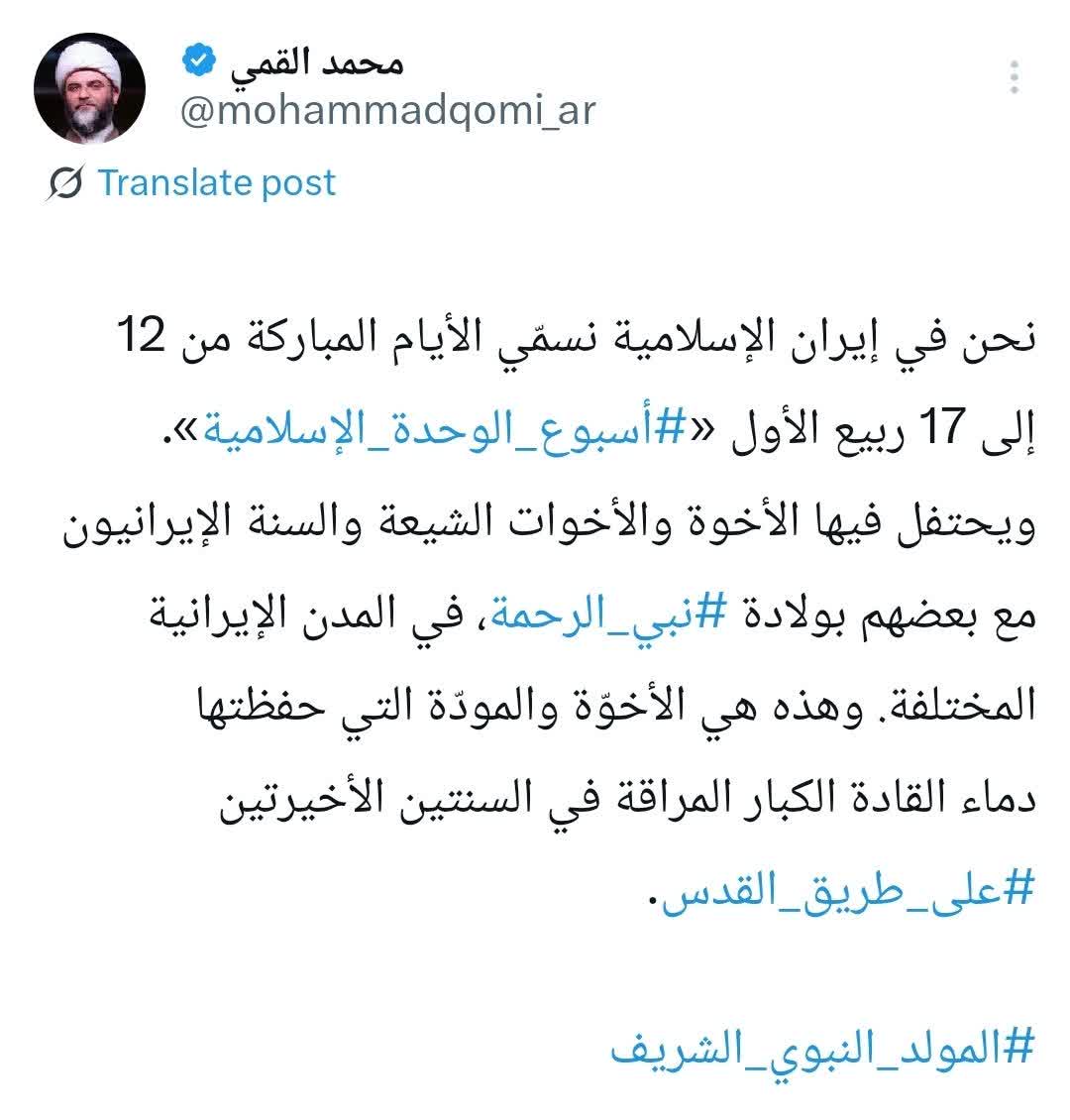 به گزارش روابط عمومی سازمان تبلیغات اسلامی، حجتالاسلام محمد قمی، رئیس سازمان تبلیغات اسلامی به مناسبت هفته وحدت در صفحه شخصی خود در شبکه اجتماعی ویراستی نوشت؛