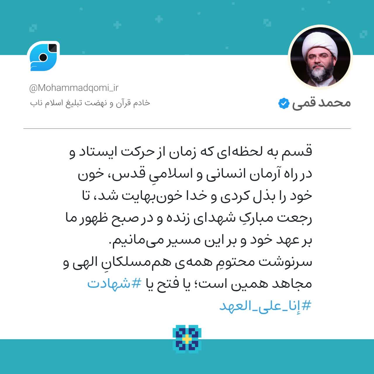 همچنین حجتالاسلام قمی همین متن را به زبانی عربی در شبکه اجتماعی ایکس نیز منتشر کرد.