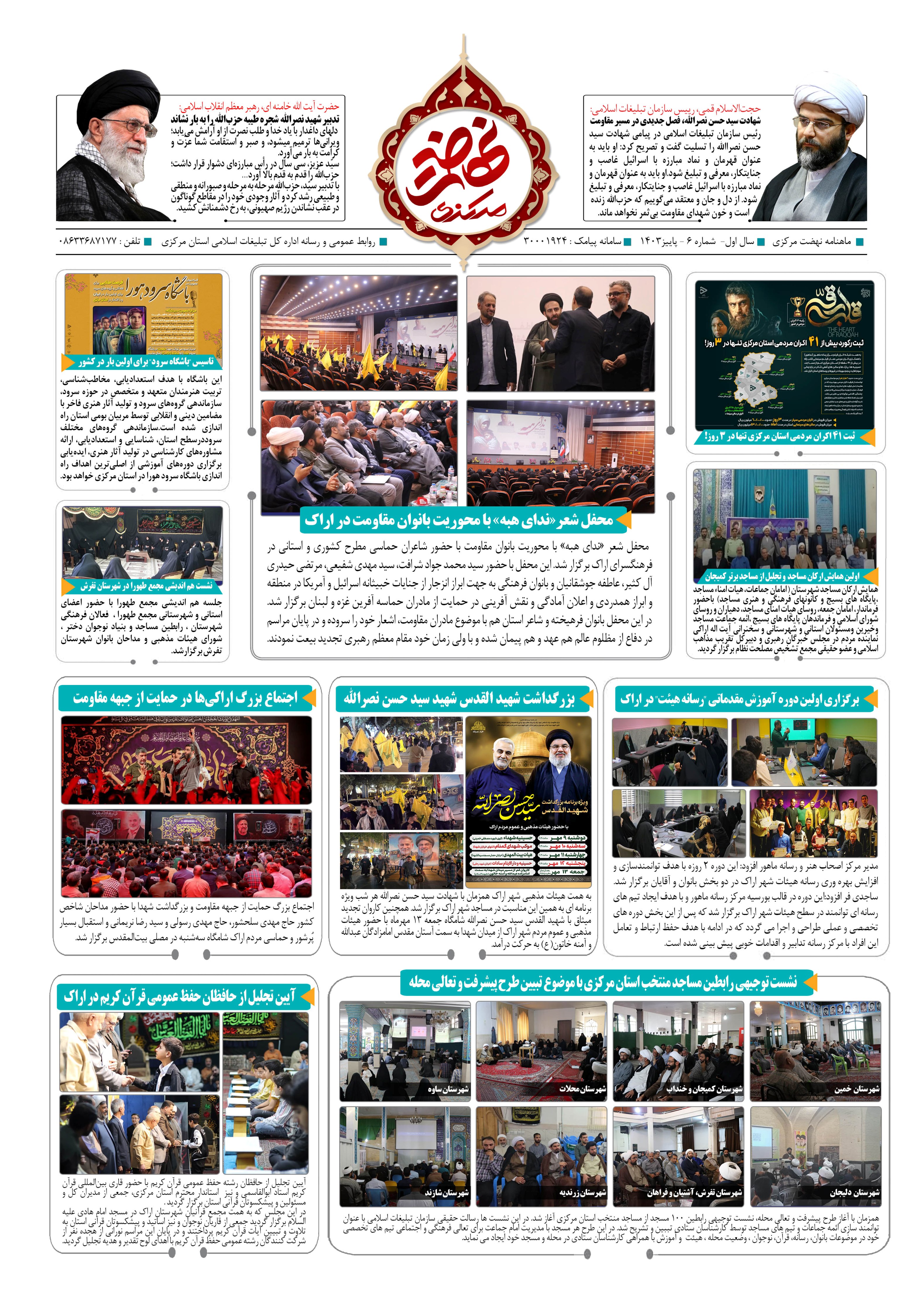 ششمین شماره ماهنامه نهضت مرکزی اداره کل تبلیغات اسلامی استان مرکزی با موضوع فعالیت های مجموعه های مختلف ستادی و شهرستان در مهرماه ۱۴۰۳ منتشر شد.